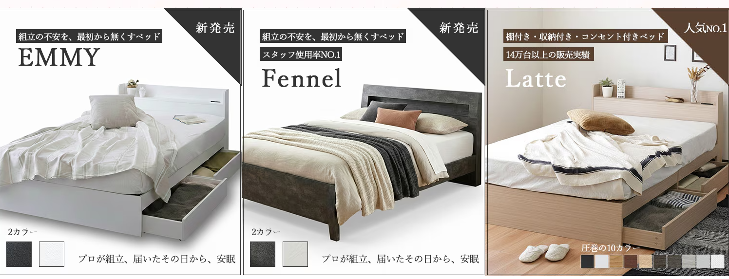 「組立が苦手で通販ベッドが買えない」 という声から生まれた一台。 組み立て設置がセットになっており、 届いたらすぐに使える。
