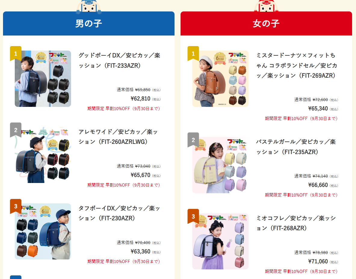 例えば人気の グッドボーイDXは 通常 ¥69,850 → ¥62,810(税込) パステルガールは 通常 ¥74,140 → ¥66,660(税込)