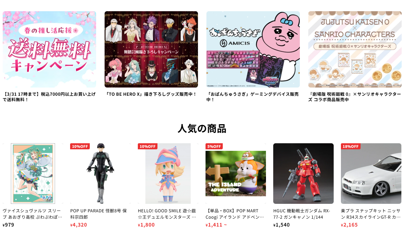 2026年3月31日(火)17:00まで、「春の推し活応援キャンペーン」を開催中。通常は10,000円(税込)以上で送料無料のところ、期間中は7,000円以上のお買い物で国内送料が無料になります。新年度に向けて推しグッズをまとめ買いするなら、まさに今がチャンスです。