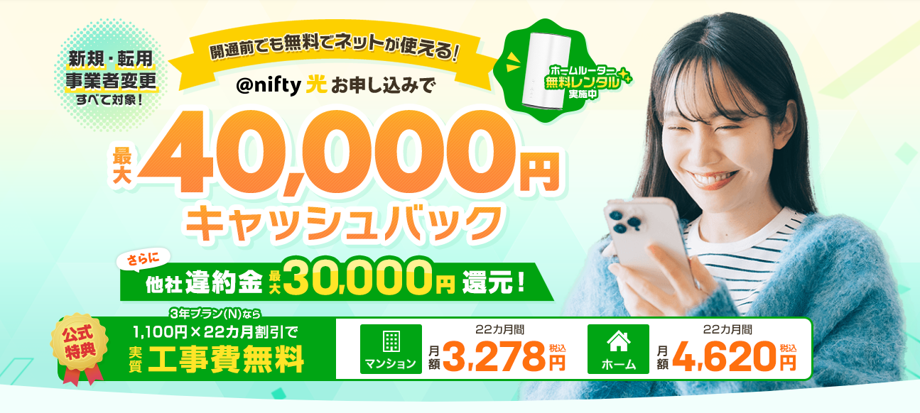 代理店独自のキャッシュバックに加え、ニフティ公式のポイント還元や月額割引が併用できる場合も。オペレーターに「一番おトクな組み合わせ」を相談しましょう。