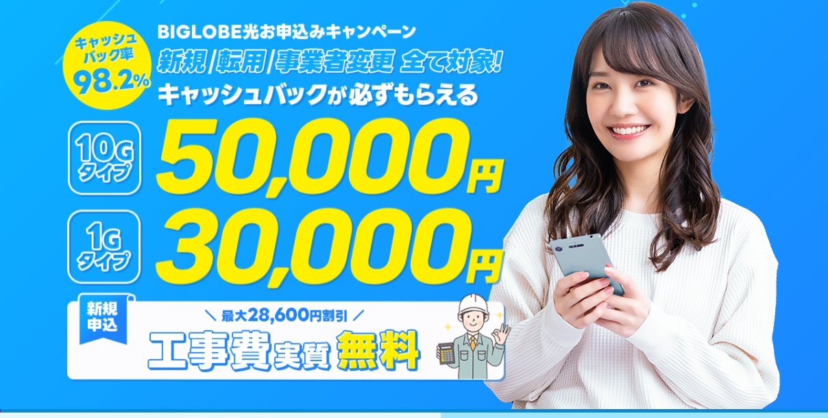 【工事費実質無料キャンペーン】 初期費用を実質0円に抑えつつ、キャッシュバックも受け取れる「いいとこ取り」のプランです。