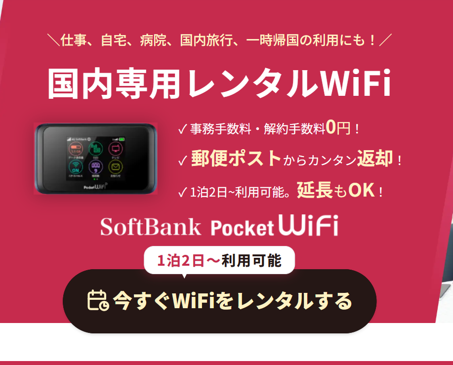 そんな「今すぐネットを使いたい!」というニーズに応える最強の味方が、グローバルモバイルの「日本国内専用ソフトバンクWi-Fiレンタル」です。